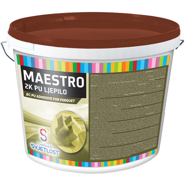 MAESTRO 2KPU клей для паркета это двухкомпонентный реакционный полиуретановый клей, без добавления воды и растворителей, для приклеивания всех видов паркета, плитки из природного камня, керамики и металла на впитывающие и невпитывающие бетонные, деревянные и на другие основания. Смесь обладает водостойкостью и термостойкостью.